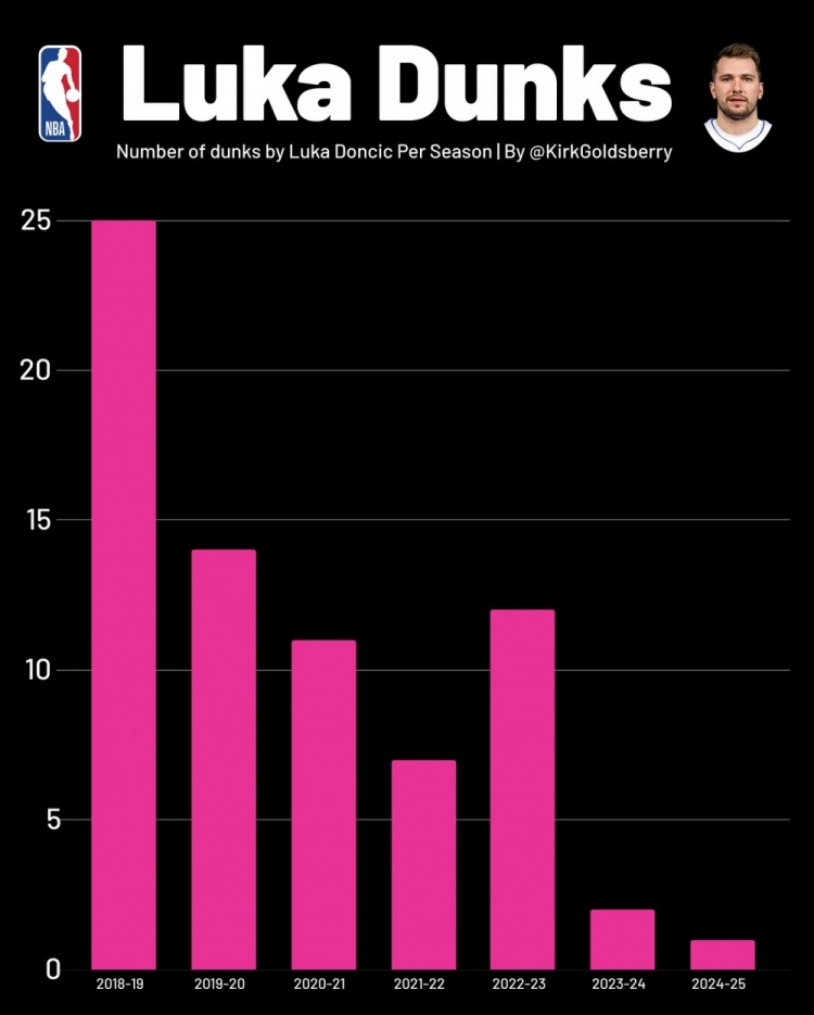 备注:自加盟湖人以来 东契奇还没有在比赛中完成过一次扣篮